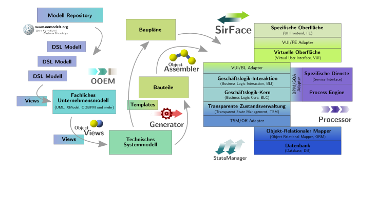 Links sind die Modelle dargestellt, mit denen Sie als BB-Anwender direkt in Berührung kommen. Diese fachlich ausgerichteten Modelle werden in ein Architektur-Modell der Software überführt, aus dem Bauteile und Baupläne für die Geschäftsanwendung angefertigt werden. Anhand der Baupläne wird dann zur Laufzeit vollautomatisch Ihr fertiges System zusammengebaut, was der Grund für die ungeheure Flexibilität von EM/OS ist.